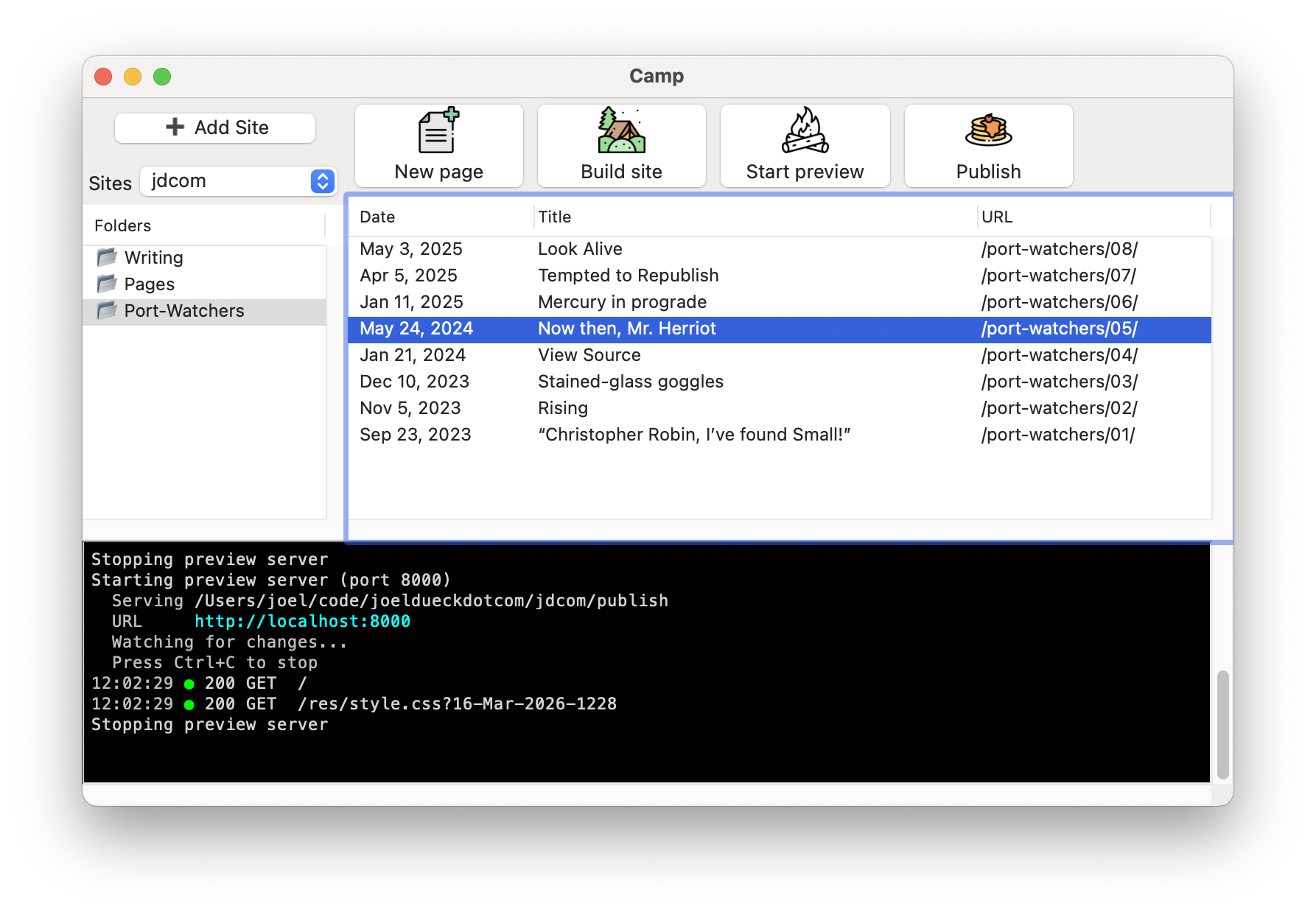 Camp comes with Camp Computer, a simple app that hides all the site scaffolding and removes friction from common operations when you’re ready to write. (The app is not intended to be an IDE for designing and developing the site itself.)