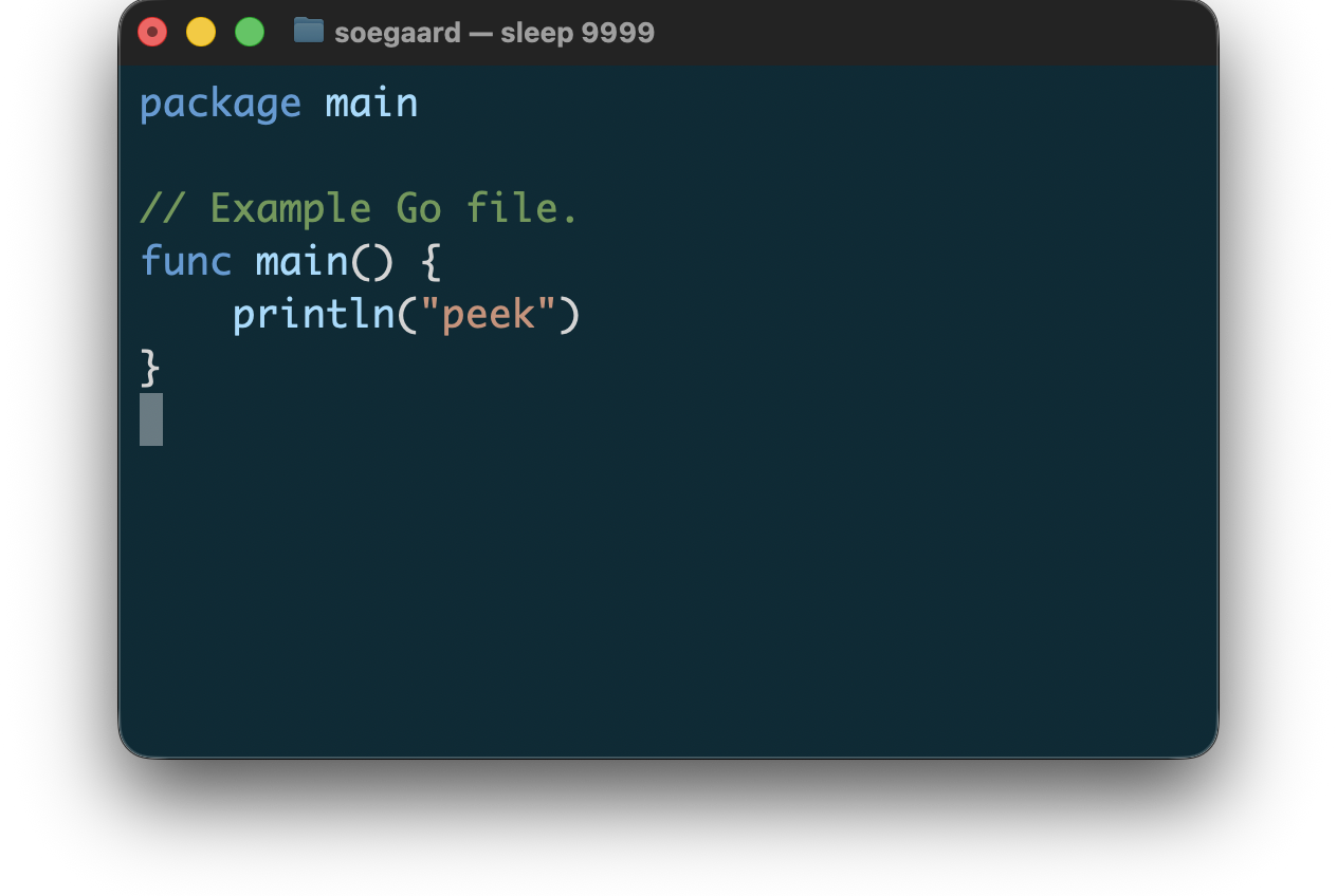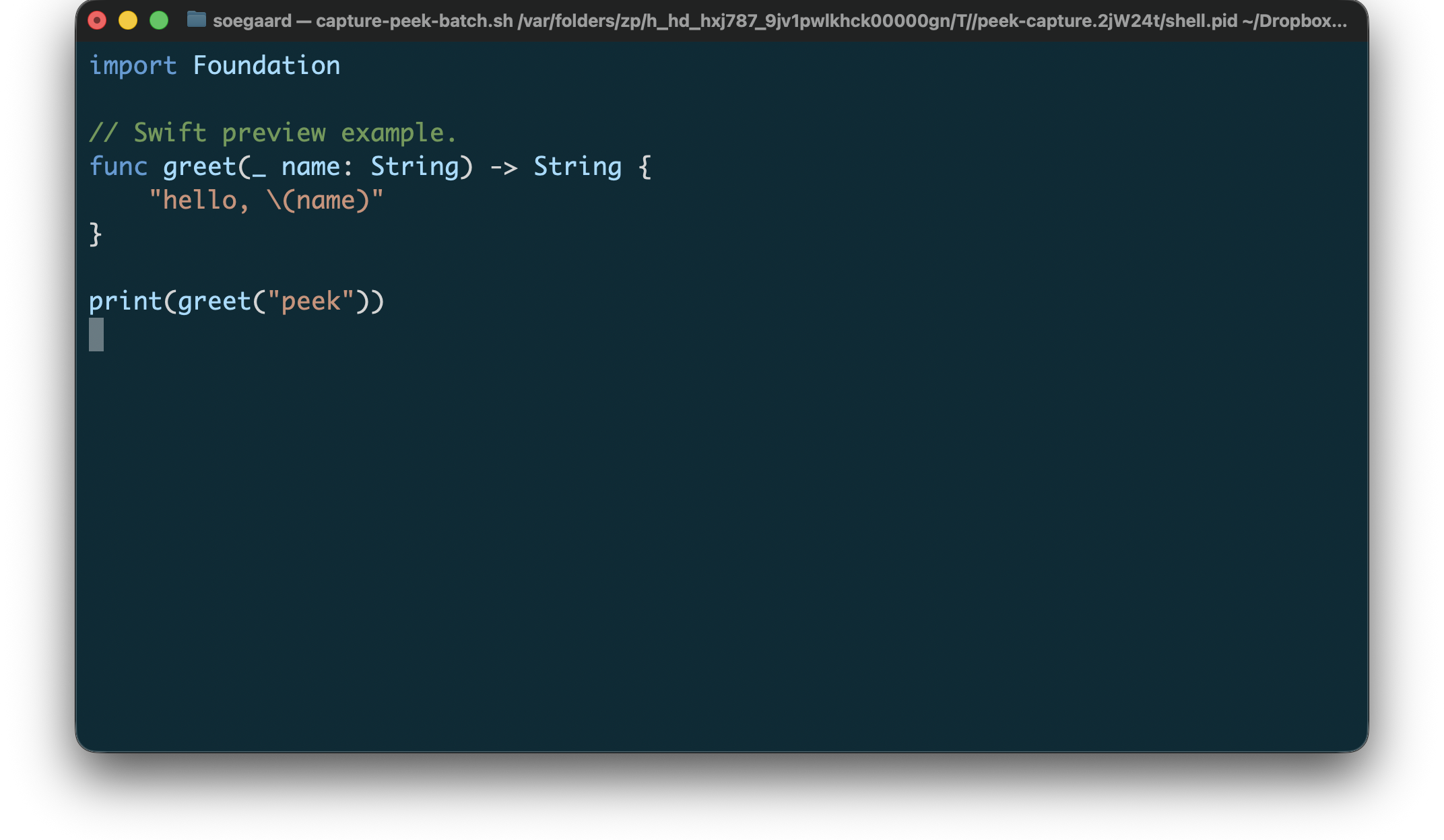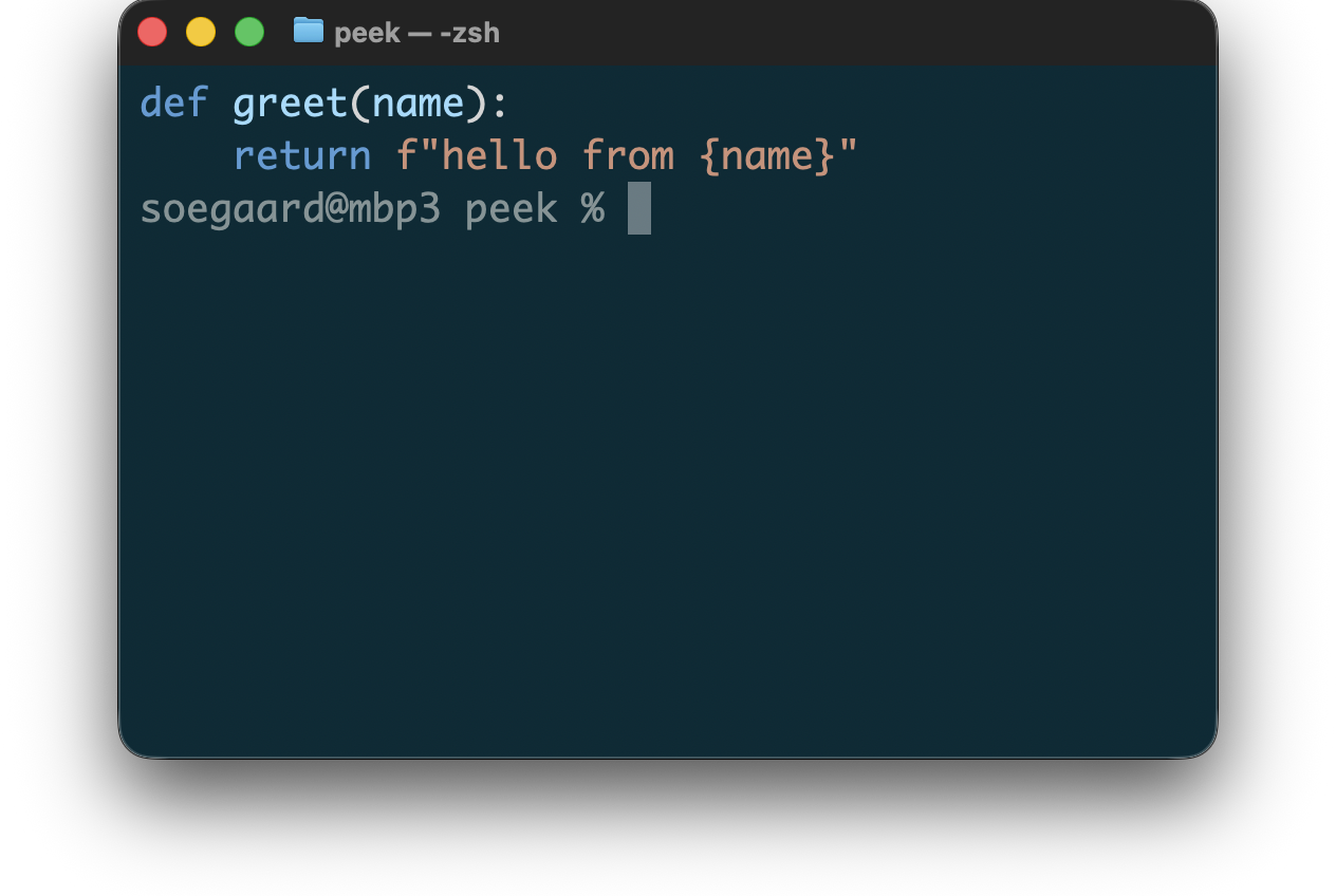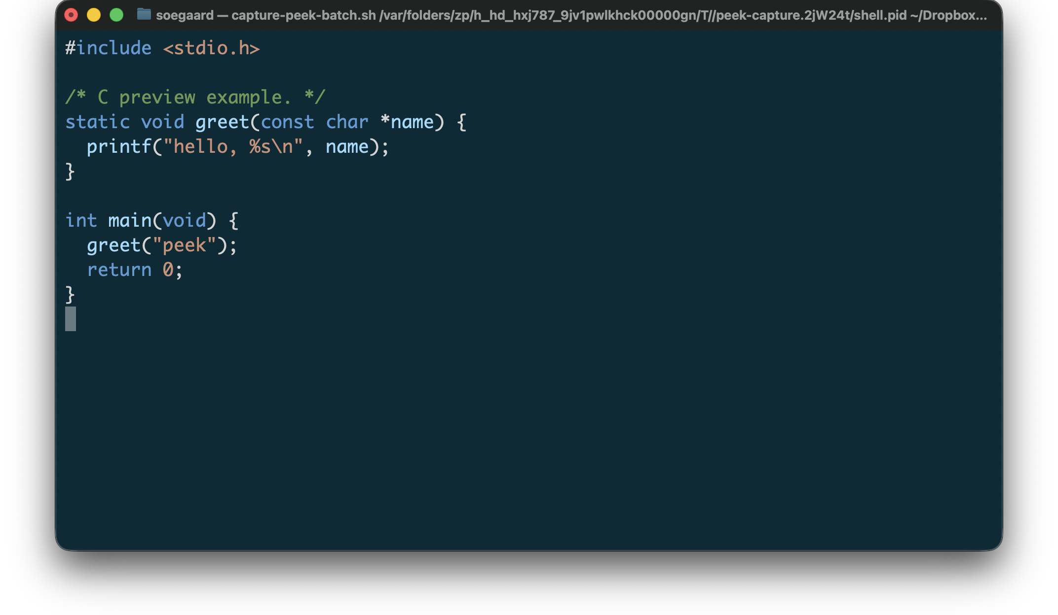 peek previews files directly in the terminal, with syntax-aware coloring for supported file types and a binary fallback for non-text data.