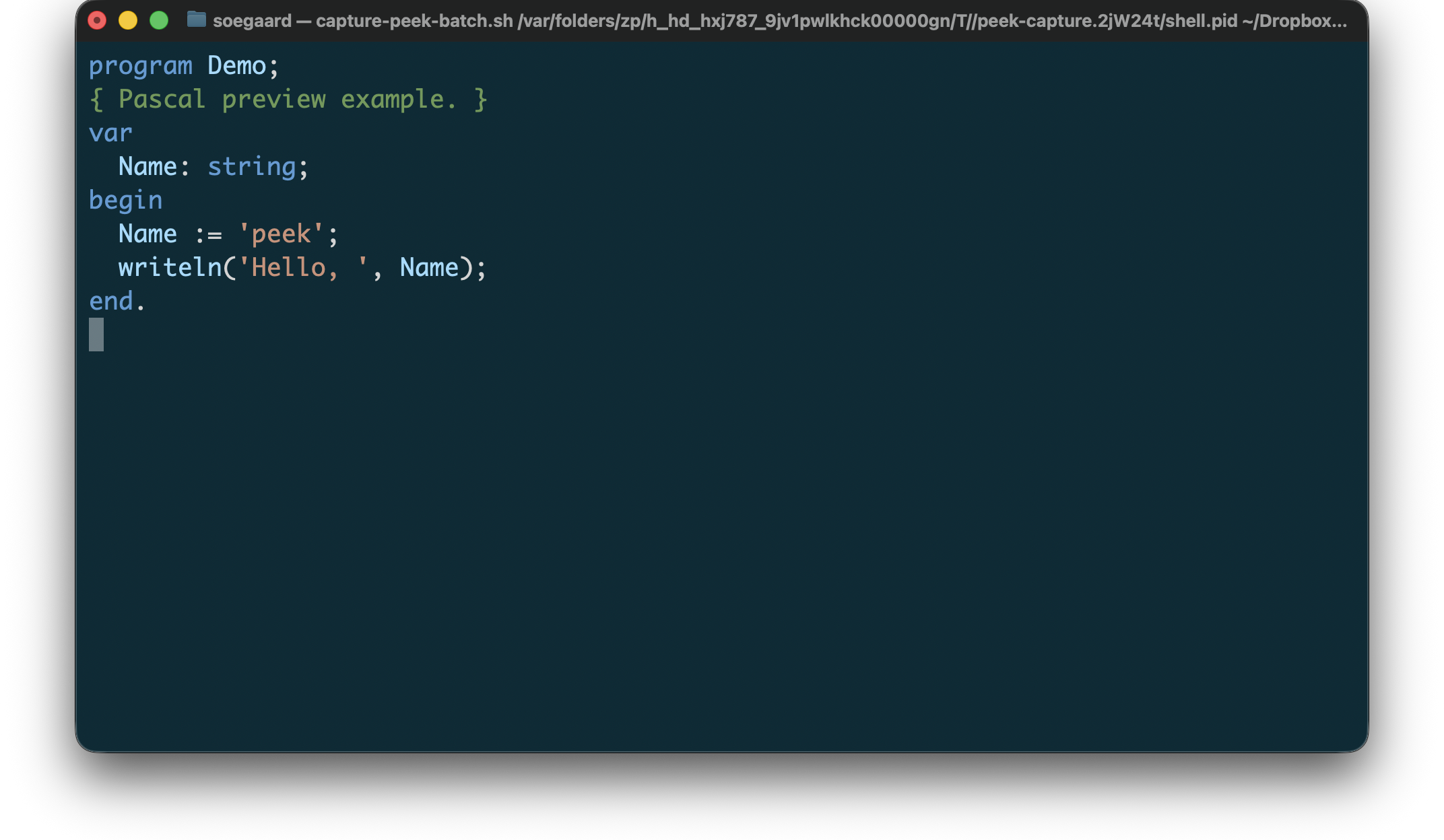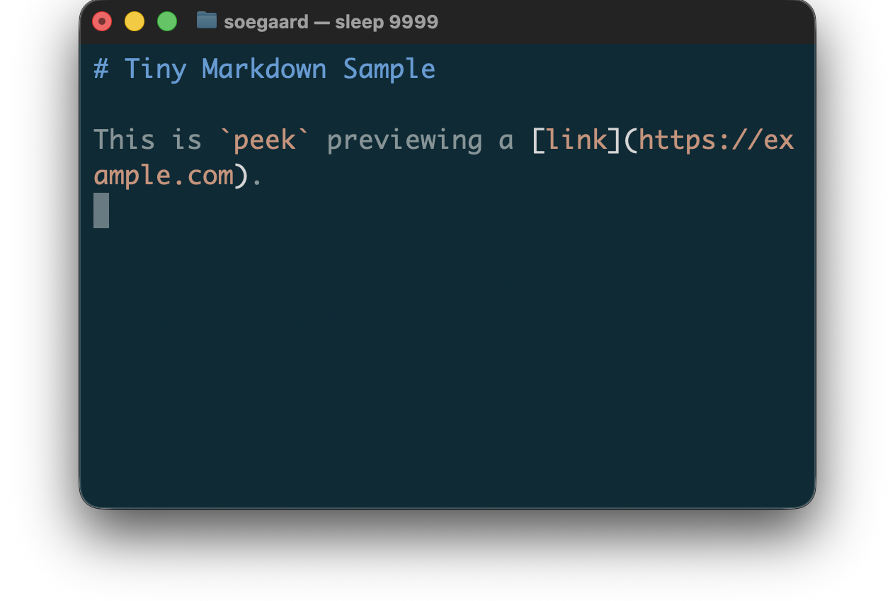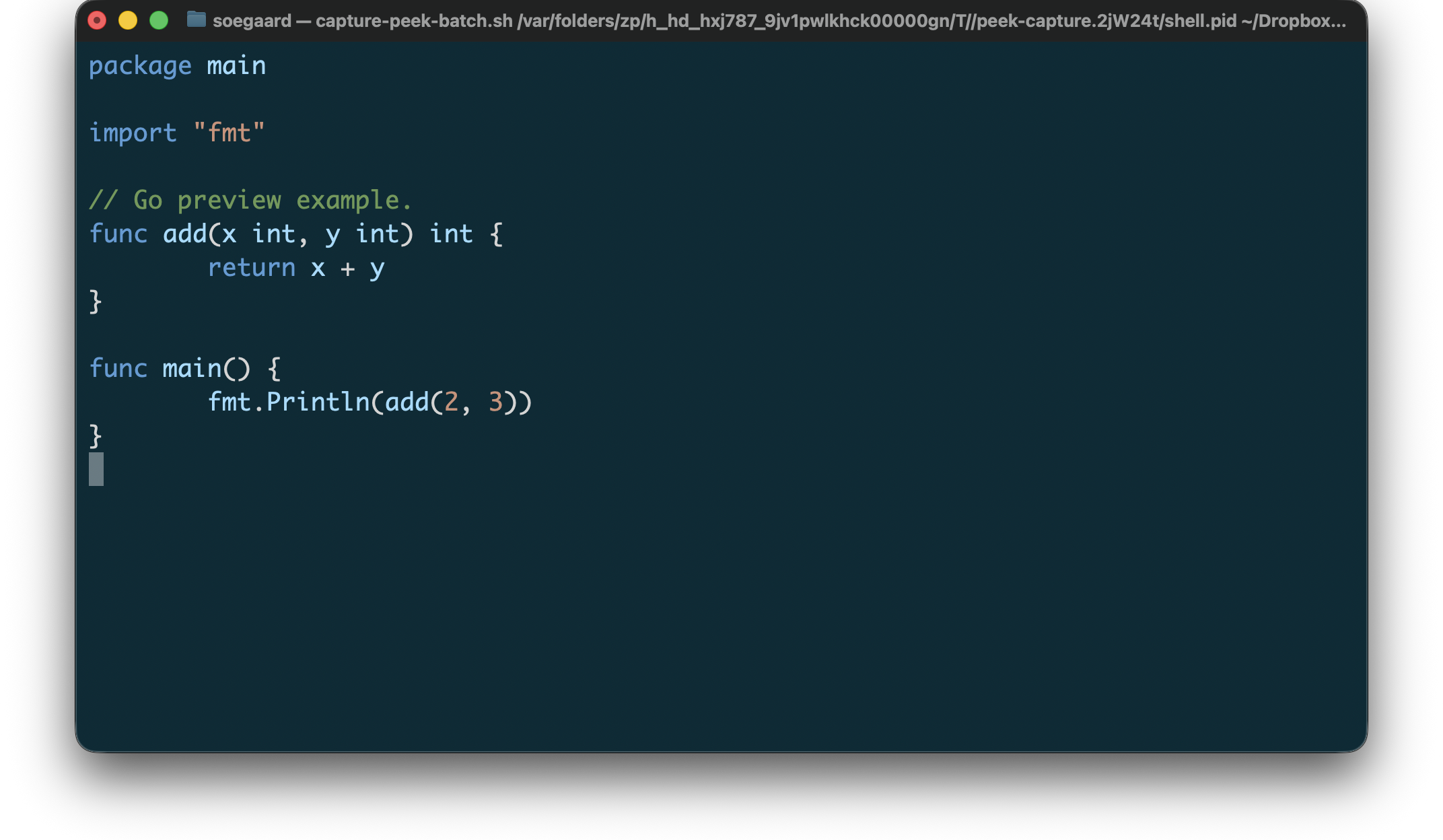 peek previews files directly in the terminal, with syntax-aware coloring for supported file types and a binary fallback for non-text data.