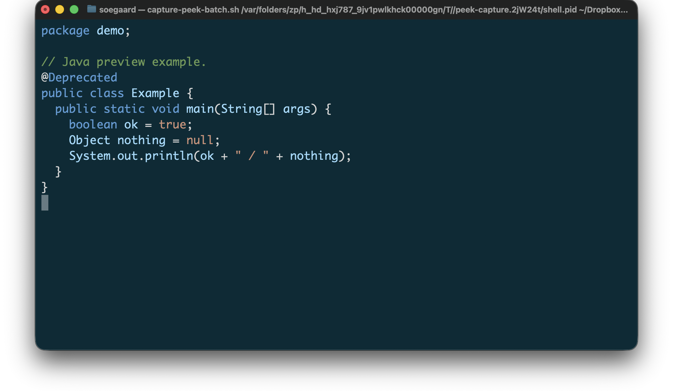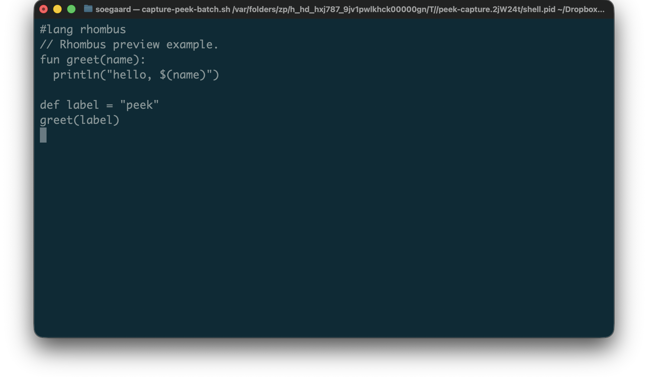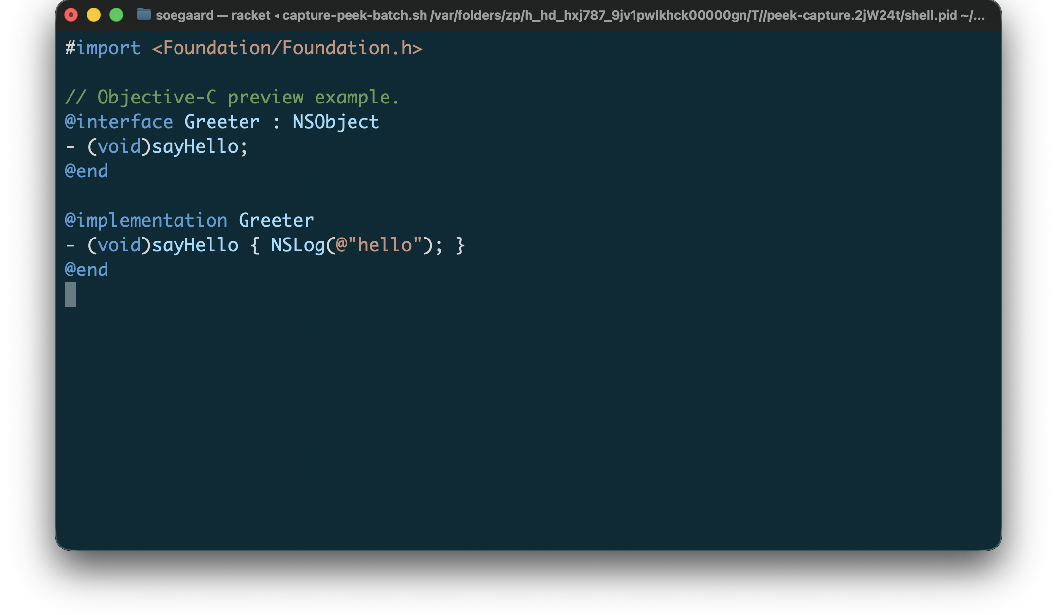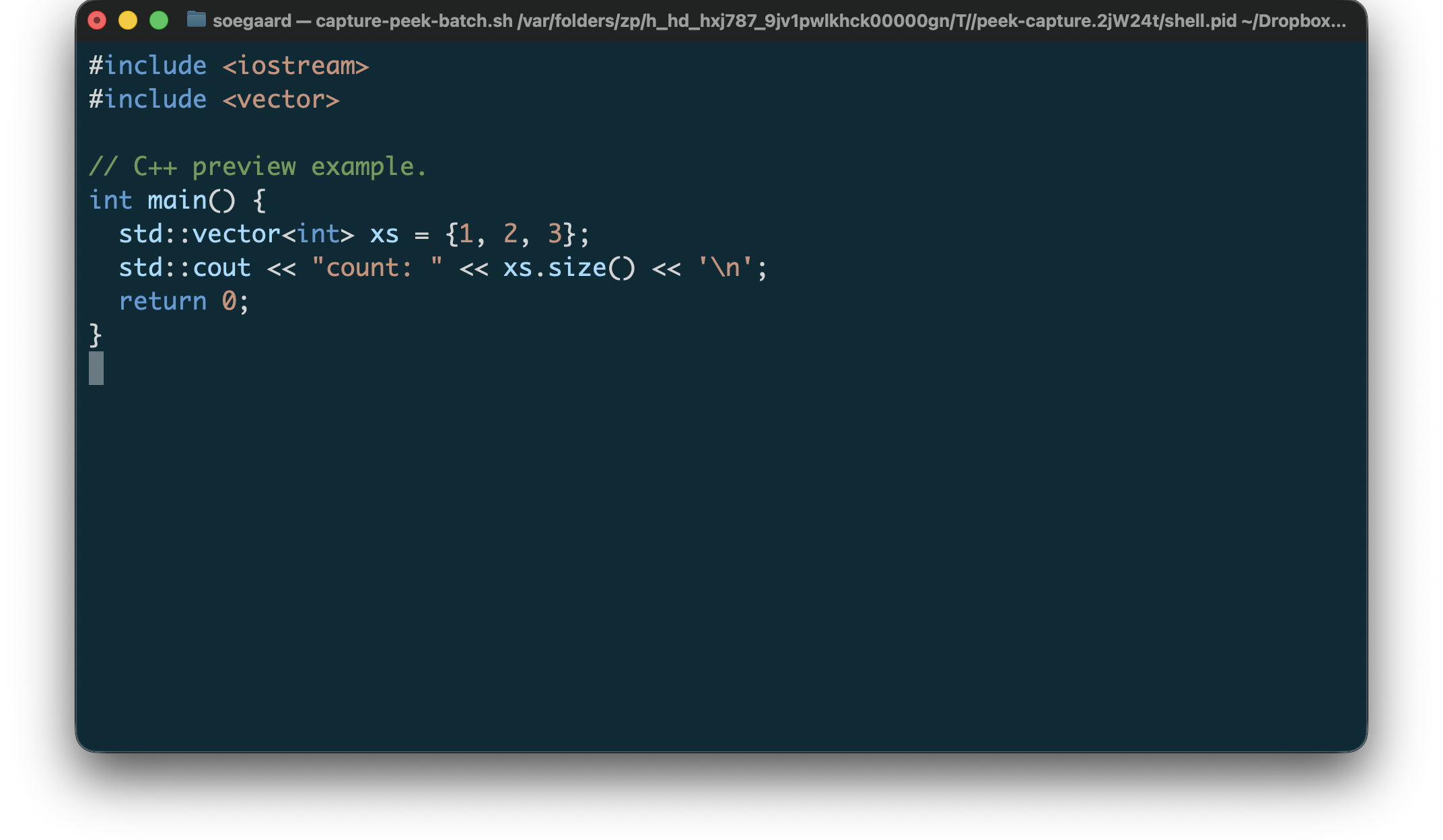 peek previews files directly in the terminal, with syntax-aware coloring for supported file types and a binary fallback for non-text data.