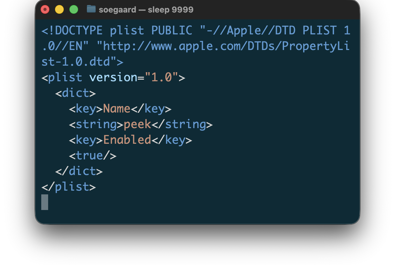 1 <?xml version="1.0" encoding="UTF-8"?> 2 <!DOCTYPE plist PUBLIC "-//Apple//DTD PLIST 1.0//EN" "http://www.apple.com/DTDs/PropertyList-1.0.dtd"> 3 <!-- Property list preview example. --> 4 <plist version="1.0"> 5 <dict> 6 <key>Name</key> 7 <string>peek & preview</string> 8 <key>Enabled</key> 9 <true/> 10 </dict> 11 </plist>