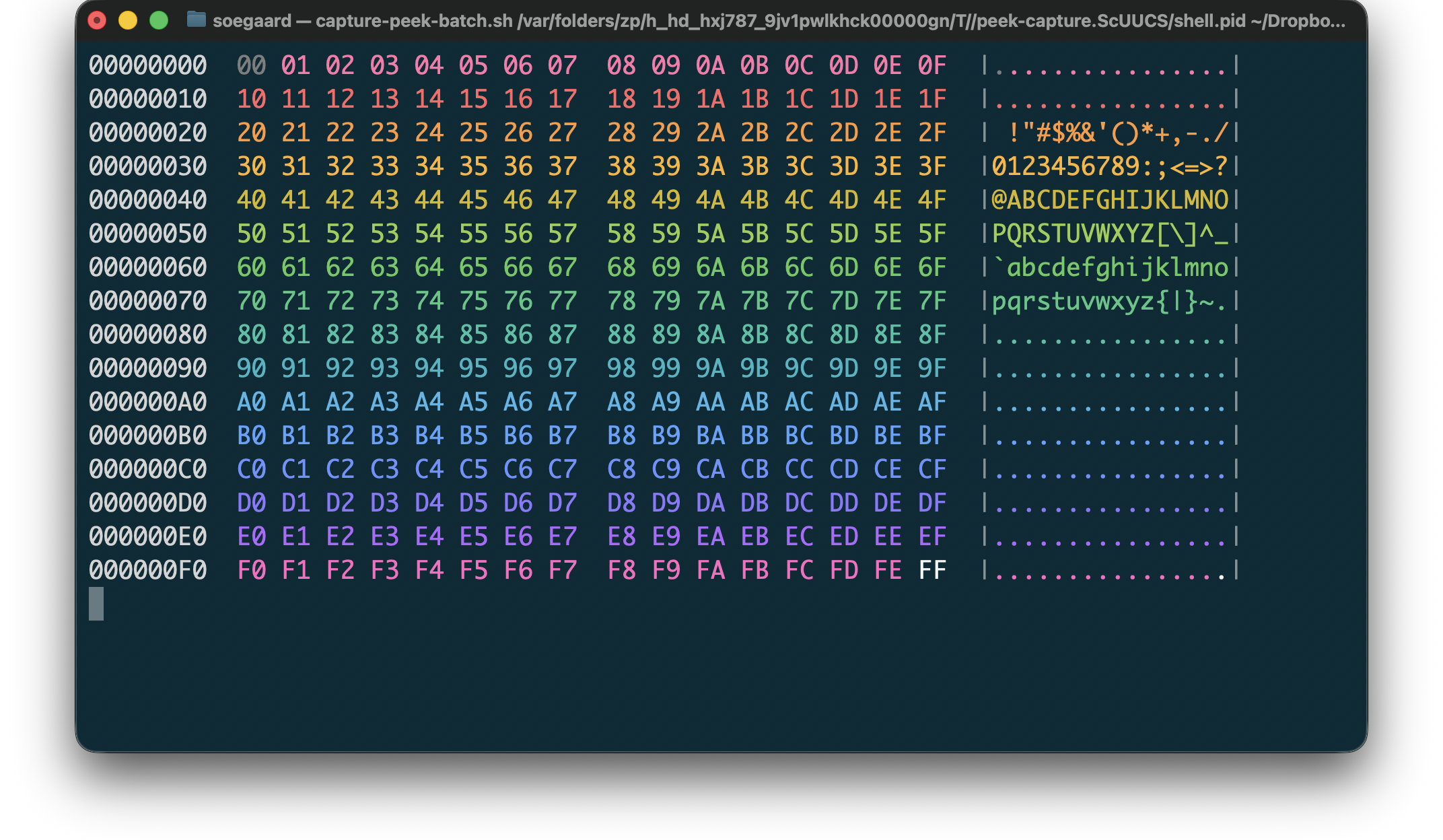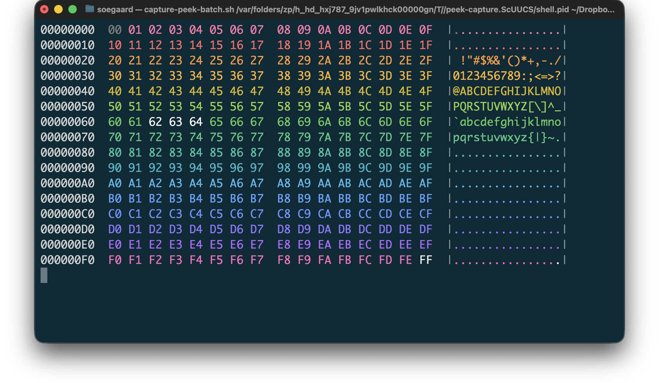 1 # Binary preview examples. 2 peek all-bytes.bin 3 peek --search-bytes 42 all-bytes.bin 4 peek --search-bytes 4243 --search-bytes c0 all-bytes.bin 5 peek --search-text bcd all-bytes.bin