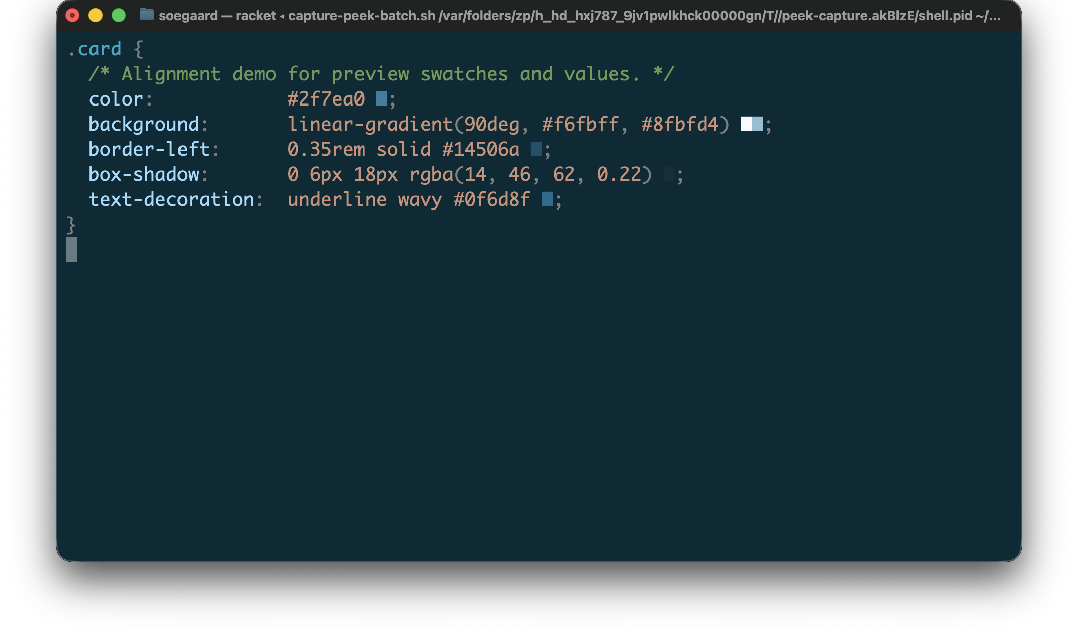 1 .card { 2 /* Alignment demo for preview swatches and values. */ 3 color: #2f7ea0; 4 background: linear-gradient(90deg, #f6fbff, #8fbfd4); 5 border-left: 0.35rem solid #14506a; 6 box-shadow: 0 6px 18px rgba(14, 46, 62, 0.22); 7 text-decoration: underline wavy #0f6d8f; 8 }