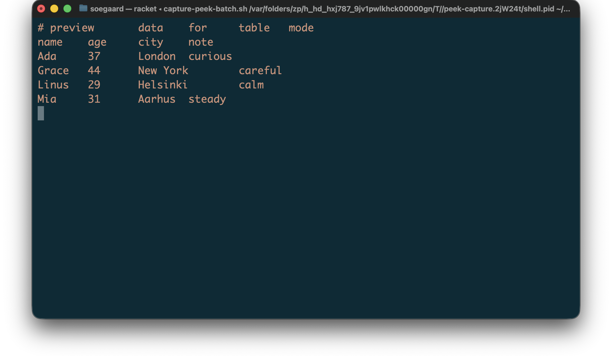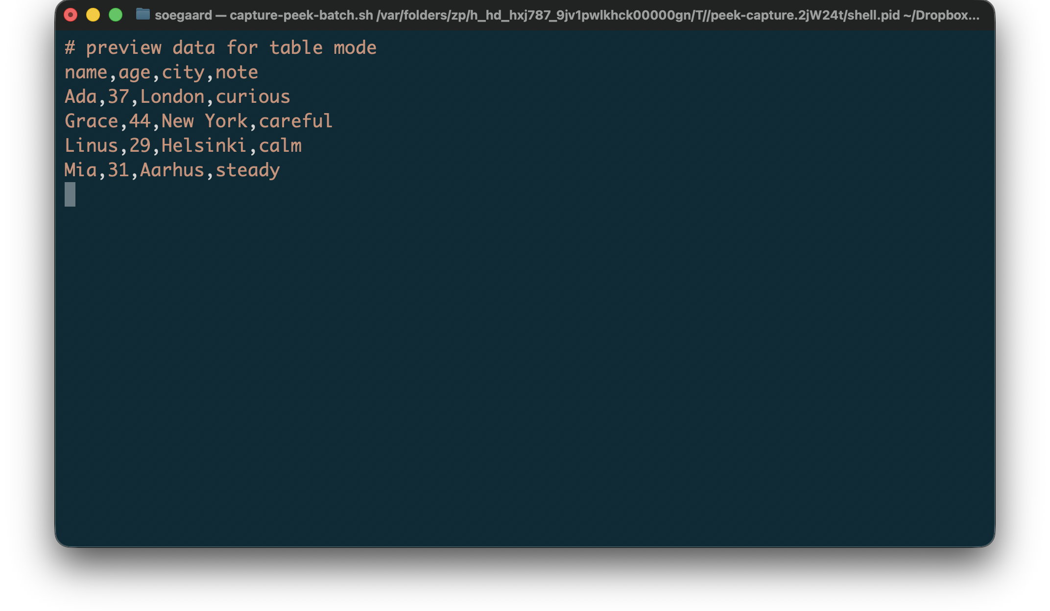 1 # preview data for table mode 2 name age city note 3 Ada 37 London curious 4 Grace 44 New York careful 5 Linus 29 Helsinki calm 6 Mia 31 Aarhus steady