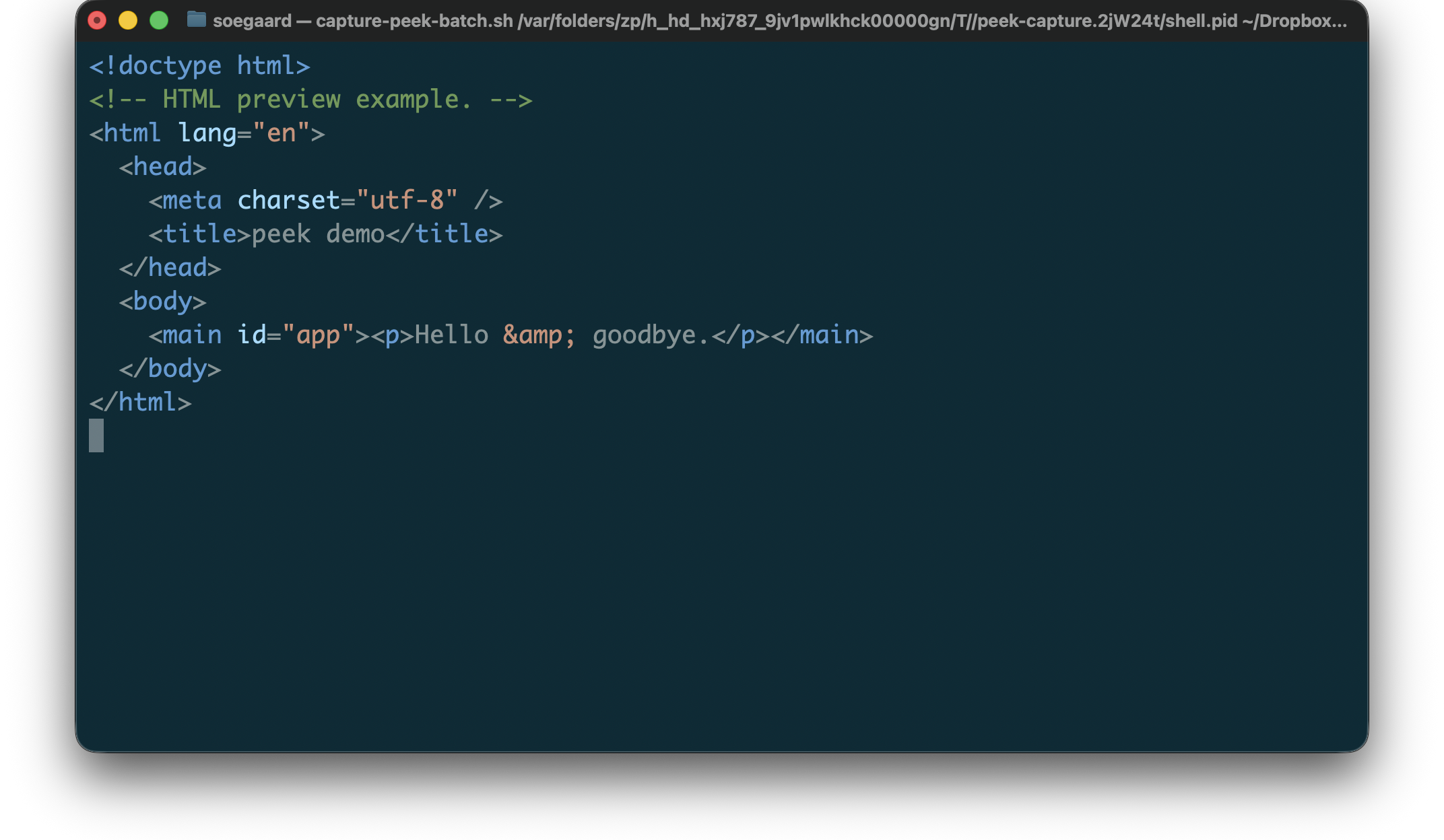 1 <!doctype html> 2 <!-- HTML preview example. --> 3 <html lang="en"> 4 <head> 5 <meta charset="utf-8" /> 6 <title>peek demo</title> 7 </head> 8 <body> 9 <main id="app"><p>Hello & goodbye.</p></main> 10 </body> 11 </html>