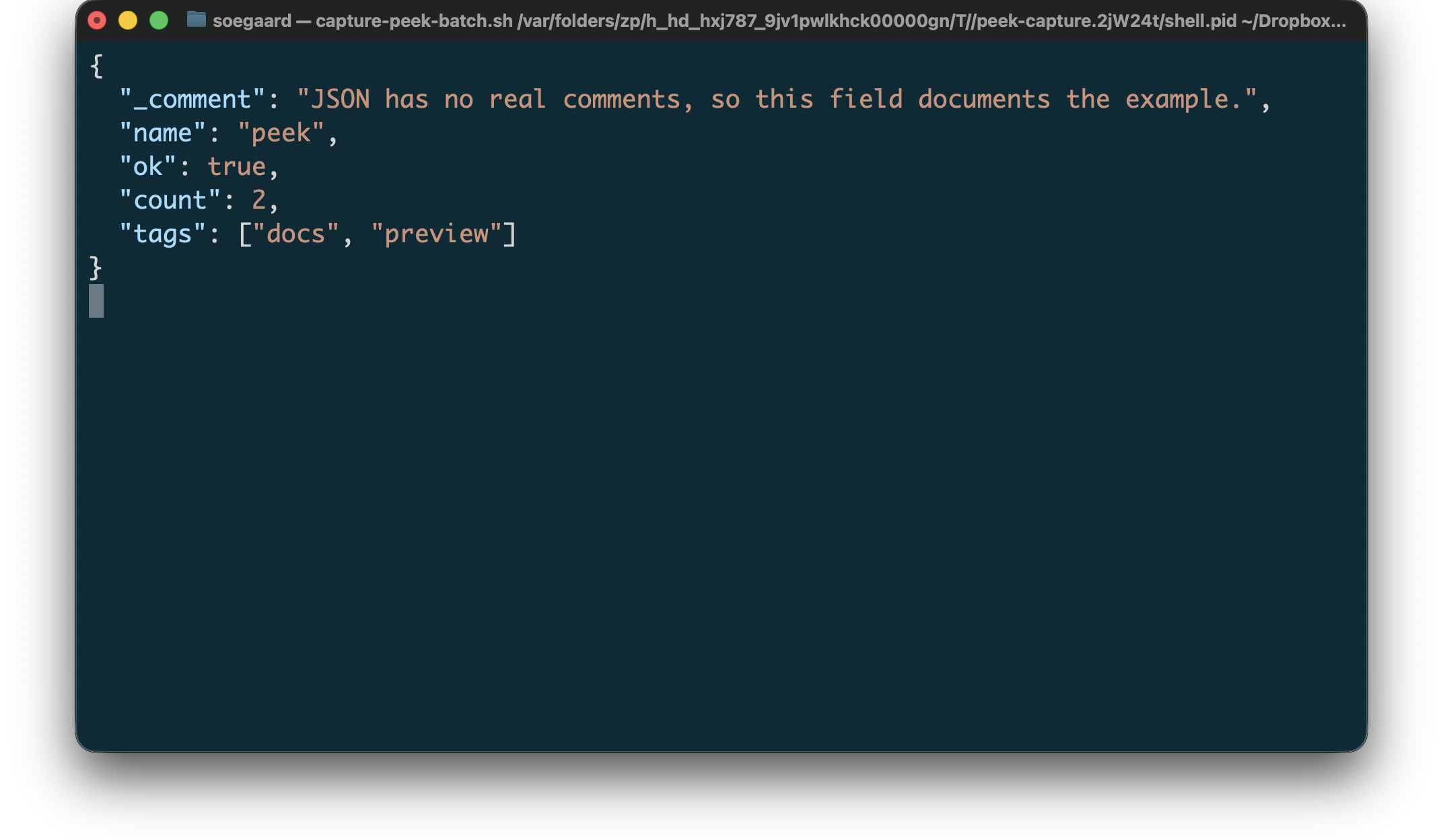 1 { 2 "_comment": "JSON has no real comments, so this field documents the example.", 3 "name": "peek", 4 "ok": true, 5 "count": 2, 6 "tags": ["docs", "preview"] 7 }