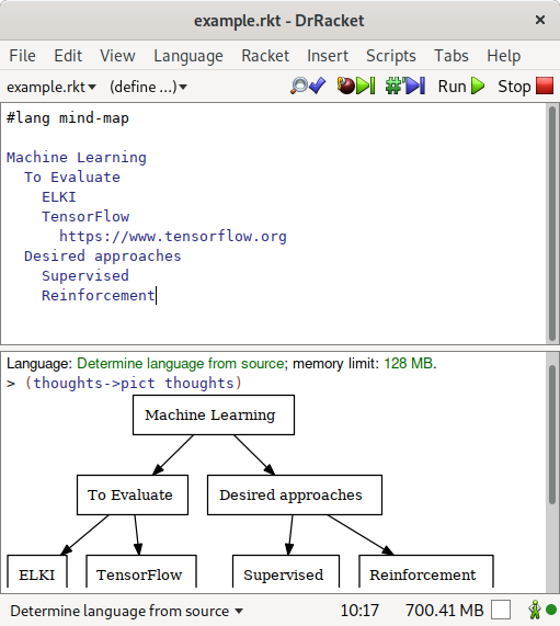 Write #lang mind-map at the top of the previous example. Save it as "example.rkt", then require it in a REPL. You will get a thoughts identifier bound to a list. That list represents the parse tree of a mind map.