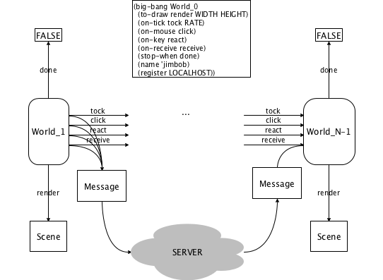 The following picture provides an intuitive overview of the workings of a world program in the form of a state transition diagram.