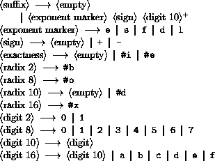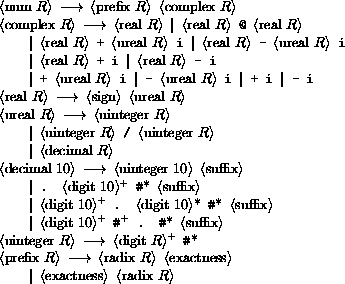 The following rules for <num R>, <complex R>, <real R>, <ureal R>, <uinteger R>, and <prefix R> should be replicated for R = 2, 8, 10, and 16. There are no rules for <decimal 2>, <decimal 8>, and <decimal 16>, which means that numbers containing decimal points or exponents must be in decimal radix.